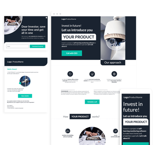 Dedicated to startups sets of landing page, pop up and newsletter templates completed with how-to-use guidelines and an ebook to make your goal successful