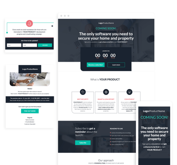 Show your product or service and build interest in your potential customers! Introduce your startup and explain how your offer can improve others lives. There are four landing page templates here: for a product sale, a sale for a product in few variants, presentation of a coming soon product and presentation of a product in few variants. Propose up to three variants of your product or encourage users to join the subscriber list.